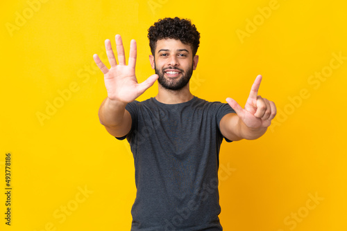Young Moroccan man isolated on yellow background counting seven with fingers