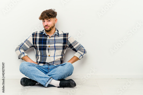 Young Moroccan man sitting on the floor isolated on white background confused, feels doubtful and unsure.