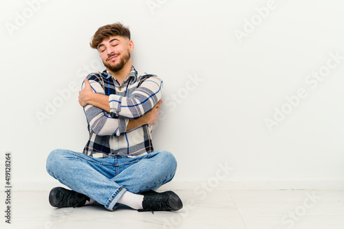 Young Moroccan man sitting on the floor isolated on white background hugs, smiling carefree and happy.