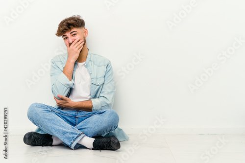 Young Moroccan man sitting on the floor isolated on white background laughing happy, carefree, natural emotion.