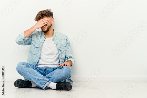 Young Moroccan man sitting on the floor isolated on white background laughs joyfully keeping hands on head. Happiness concept.