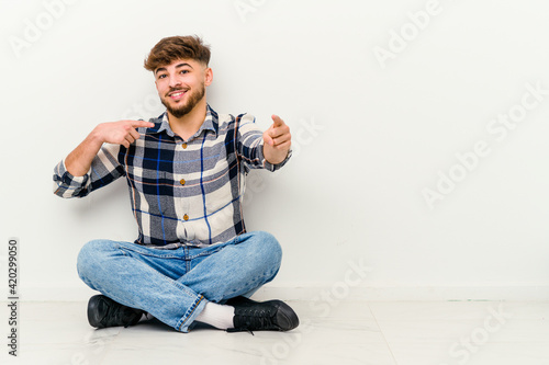 Young Moroccan man sitting on the floor isolated on white background pointing to front with fingers.