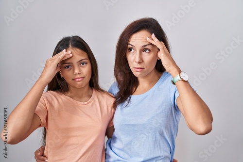 Young mother and daughter standing over white background worried and stressed about a problem with hand on forehead, nervous and anxious for crisis