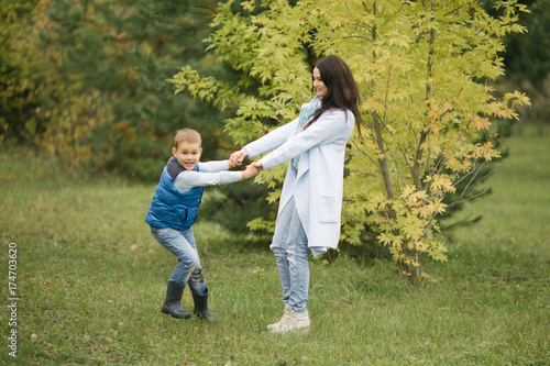 young mother and her son play in the autumn in the park, they are warmly dressed