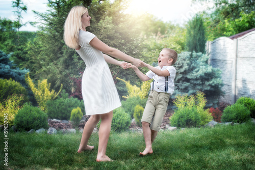 Young mother and son circling holding hands.Family vacation in the Park.