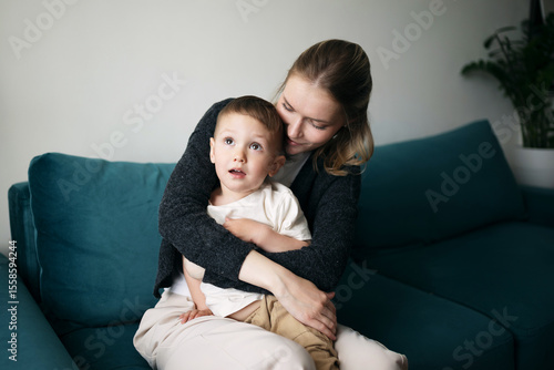 Young mother gently hugging her son while sitting together on a teal sofa at home, showing tender family love and connection.