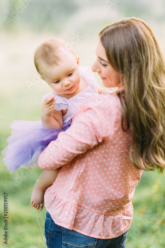 Young mother holding daughter in her arms. Beautiful Mother And Baby outdoors. Nature. Beauty Mum and her Child playing in Park together. Outdoor Portrait of happy family. Joy. Mom and Baby