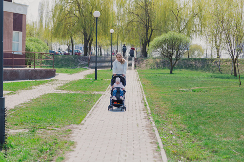 Young mother with a baby in a stroller in a summer park.