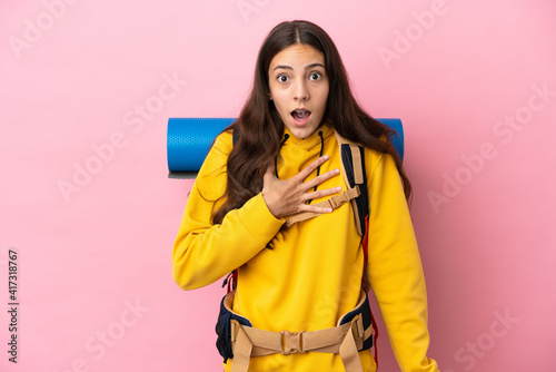 Young mountaineer girl with a big backpack isolated on pink background surprised and shocked while looking right