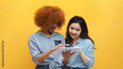 Young multiracial friends browsing social media online with excited face expressions. Afican american and asian women isolated on yellow background. High quality photo