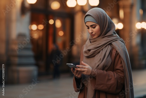 Young muslim woman with veil using a smartphone on the street while people are walking by, copy space left. Young muslim woman on urban scene.