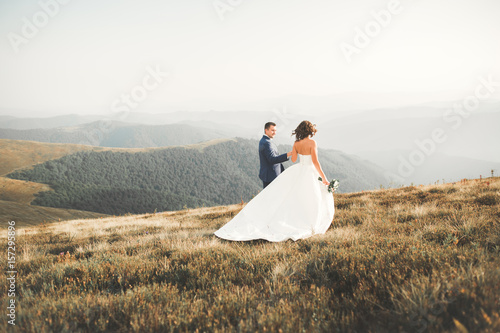 Young newly wed couple, bride and groom kissing, hugging on perfect view of mountains, blue sky