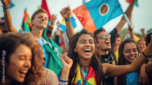 Young people cheering at a concert with flags to celebrate International Youth Day. International Youth Day