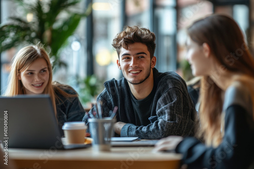young people sit at a table in a cozy cafe, chatting and laughing over cups of steaming coffee.