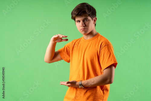 Young person expressing various emotions and body pains, pointing, using a cellphone, with colored backgrounds and wearing shirts of different colors