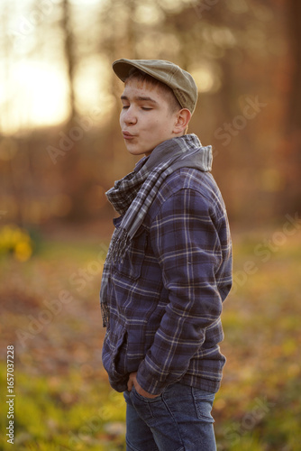 Young person in plaid jacket and cap poses outdoors at sunset with hands in pockets, giving a playful expression. Concept of carefree outdoor fashion. For autumn fashion photo.