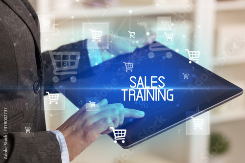 Young person makes a purchase through online shopping application with SALES TRAINING inscription