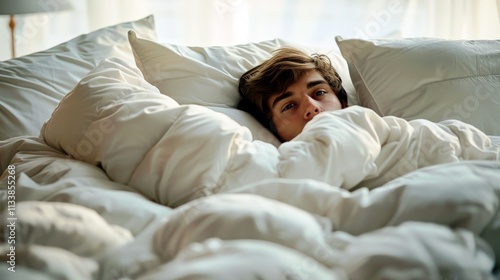 Young Person Peeking from Cozy Bed Surrounded by Soft Pillows and Warm Blankets with Soft Morning Light in Background