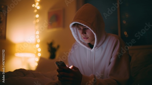 Young person with hoodie checking phone in softly lit bedroom ambiance at night