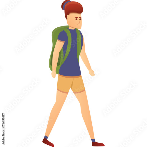 Young Person With Red Hair Wearing Blue T Shirt Tan Shorts And Red Shoes Walking With A Green Backpack On A Transparent Background