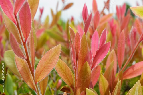 Young pinky sprouts of Bottlebrush plant Chamaedaphne calyculata after trimming. Floral background