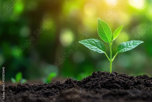Young plant growing in soil, sunlight, green background, environmental conservation