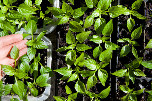 Young plant seedlings of Chili pepper vegetable, modern activity for climate change - gardening edible plants for food.