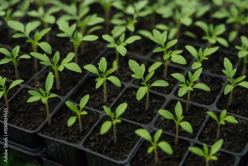 Young plant seedlings stored in drawers with tomato sprouts and fresh agricultural foliage