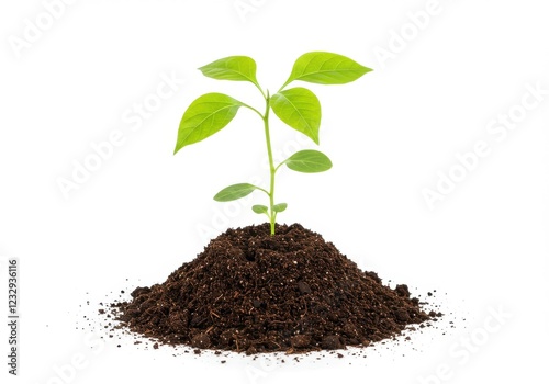 young plant with bright green leaves growing from a mound of rich, dark brown soil.