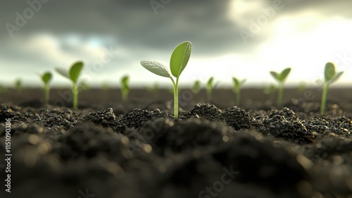Young plants emerging from rich soil under a moody sky.