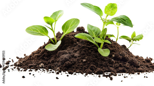 Young plants growing in fertile soil on transparent background