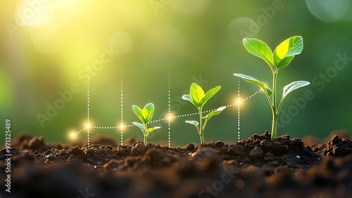Young plants growing in soil, accompanied by a rising graph line, symbolizing growth and sustainability. Perfect for themes of nature, agriculture, and development.