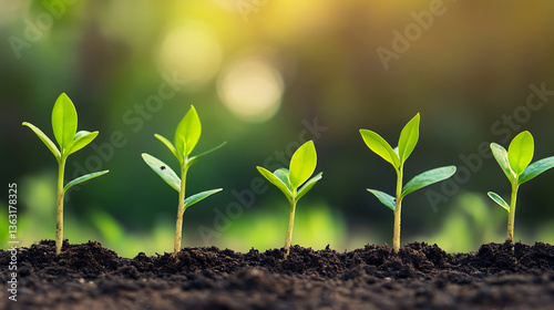 Young plants growing in soil, green seedlings sprouting outdoors, nature growth concept with sunlight, gardening and agriculture background image