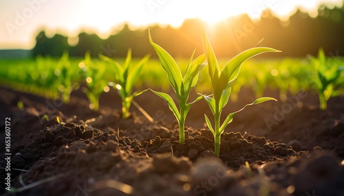 Young plants in a field at sunset
