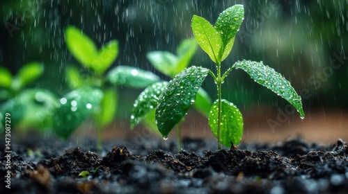 Young Plants in Soil Under Rainfall