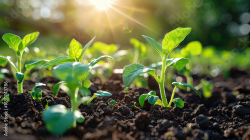 Young plants in the ground bathed in sunlight. A symbol of growth and new beginnings, a hopeful image.