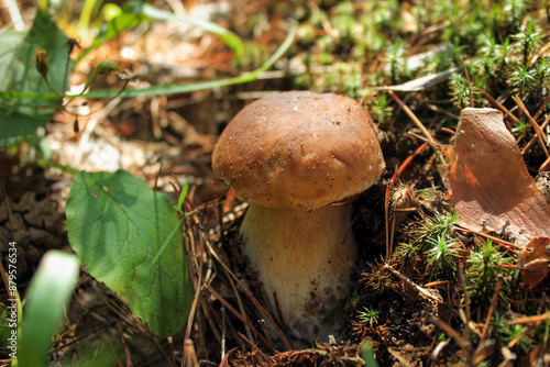 Young porcini mushroom (cep) in the forest in the rays of the setting sun