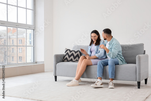Young pregnant couple with house rental agreement and key sitting on sofa in room
