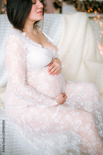 Young pregnant girl with dark hair in a lace white dress on the sofa in a Christmas setting