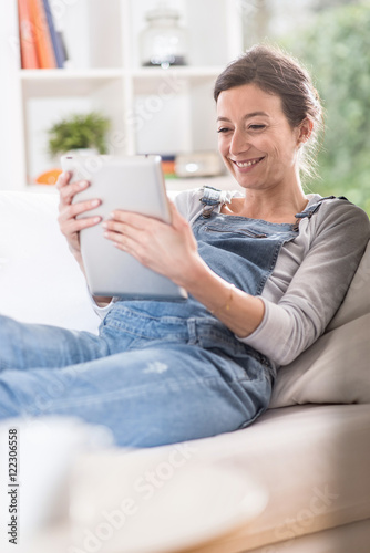 young pregnant woman at home using a tablet