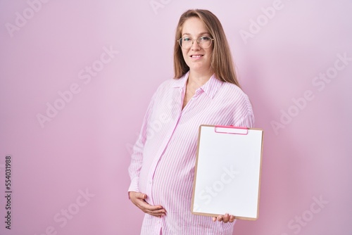 Young pregnant woman holding clipboard smiling with a happy and cool smile on face. showing teeth.