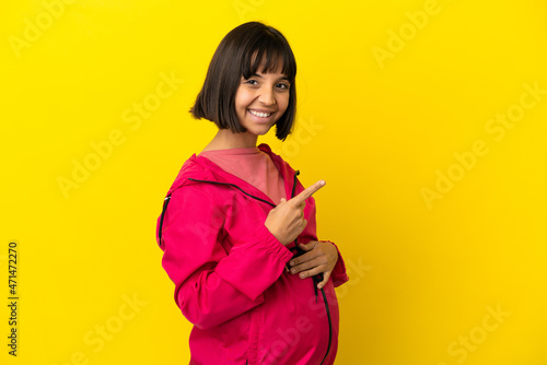 Young pregnant woman over isolated yellow background pointing to the side to present a product