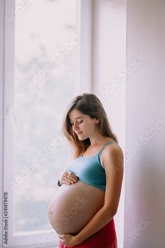 Young pregnant woman standing near window at home and thinking about the future. Smiling pregnant woman with hands on belly.