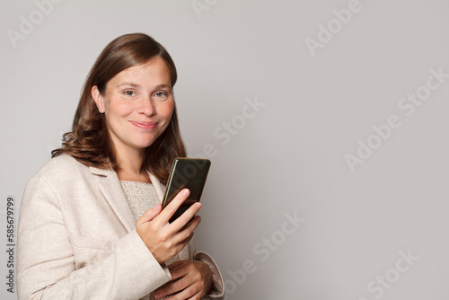 Young pregnant woman using her mobile phone to send message against white studio wall background