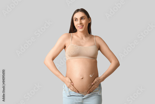 Young pregnant woman with cream against stretch marks on her belly against grey background