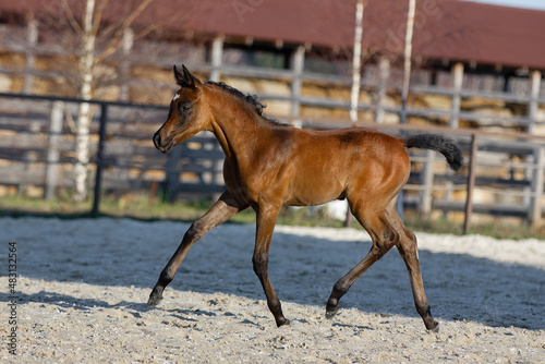 Young pretty arabian horse foal runs and frolics summer background