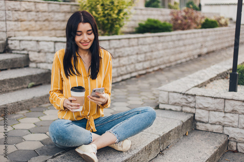 Young pretty woman with smartphone and cup of coffee sit on city street stairs