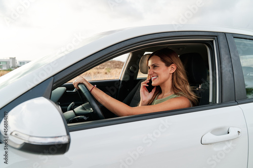 Young pretty woman talking on her smart phone while driving her car. Concept of road safety and traffic accidents.