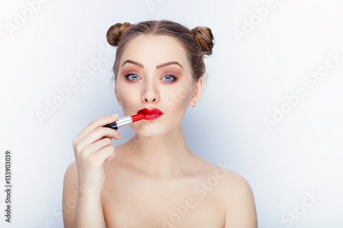 Young pretty woman trendy makeup bright red lips bun hairstyle bare shoulders act the ape with lipstick white studio background