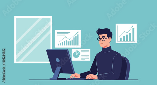 Young Professional Analyzing Data Trends at a Computer in a Minimalist Style